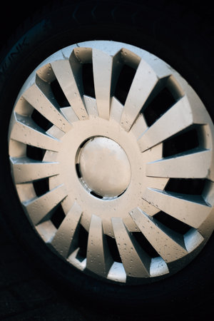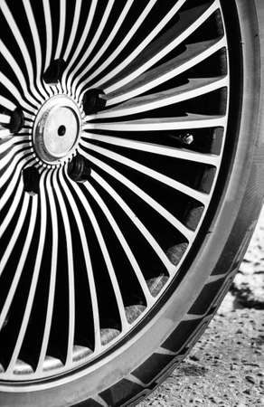 a shiny disc, black and white, a wheel of a car of old times. Close up of vehicle details. Concept of style and racing. Selective focus
