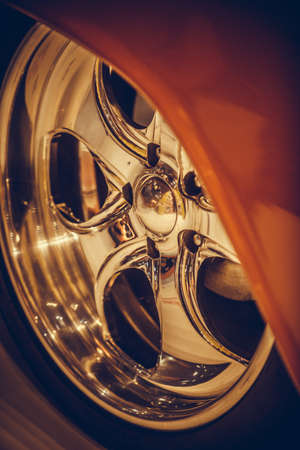 Close up shot of a chrome classic wheel rim on a vintage car.