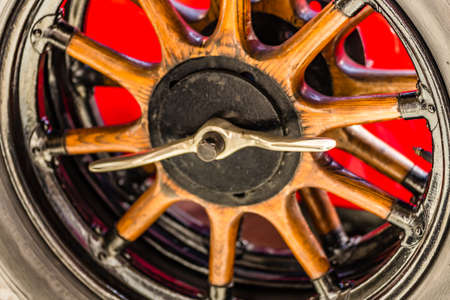 Turin, Italy - June 20, 2021: an antique automobile wheel at the Turin Automobile Museum.