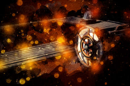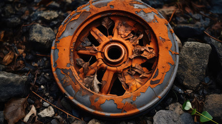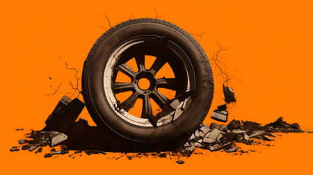 Car wheel and debris on orange background. 3D illustration. Side view.