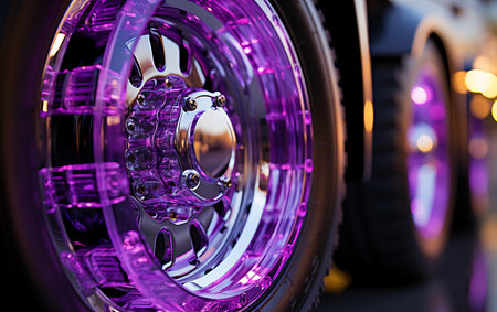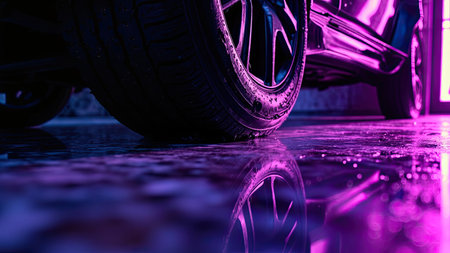A striking low-angle photograph captures a car tire's mesmerizing reflection on wet pavement, illuminated by vibrant neon purple and blue lights. The close-up detail reveals the tire's rim and textured surface, juxtaposed with the water droplets and abstract patterns. This urban, modern image is perfect for automotive design, luxury branding, or contemporary art, adding a dynamic touch to projects related to night, city life, and automotive transportation. The play of light and reflection creates a compelling visual narrative.