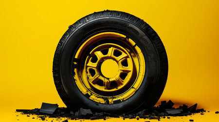 A striking image of a glossy alloy wheel featuring a polished finish, set against a vibrant black and yellow backdrop, highlighting modern automotive design.