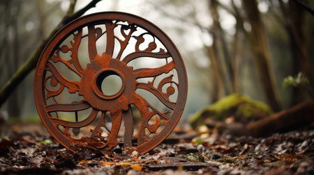 An abstract arrangement of car wheels forms a circle, emphasizing mechanical symmetry and artistic design elements, against a dark backdrop.
