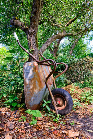 Old rusty wheelbarrow on the ground in the garden. selective focus.