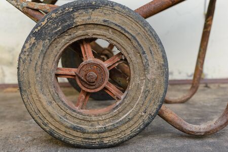 Close up view of tire of an old rusty 3-wheeled wheelbarrow with plant nature background. Using to carry heavy stuff such as cement, tools, equipments and bricks at the construction site.