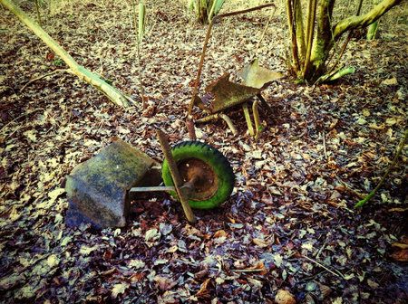 Broken and decayed wheelbarrow left in woods