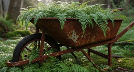 garden work with plants rusty metal wheelbarrow