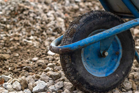 Trolley for building material. Distribution of rubble on the road. Concept: construction, road repairs, sale of crushed stone, backgrounds and textures, working tools.