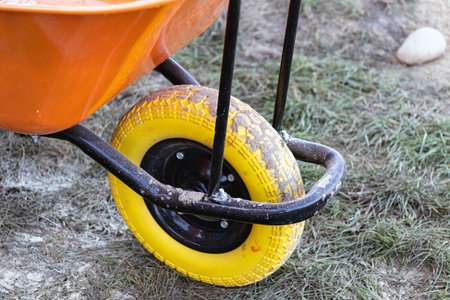 Construction wheelbarrow. Wheel - detail close up