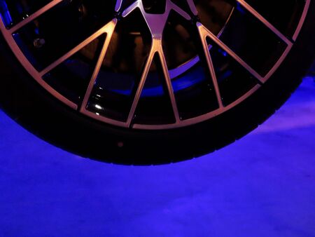 Car wheel with modern thin tire suspended above ground, in purple neon lights