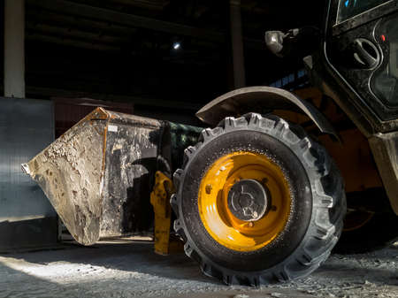Wheel and Bucket of JCB loader in a warehouse of mineral organic fertilizers. Heavy Industrial Machinery working in a plant. KRYVYI RIH, UKRAINE - JULY, 2021
