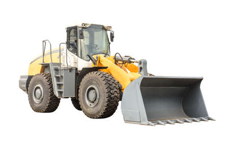 Closeup photo of big wheel loader, with isolated background