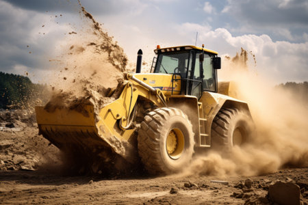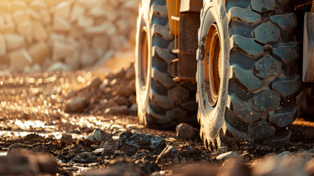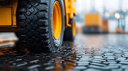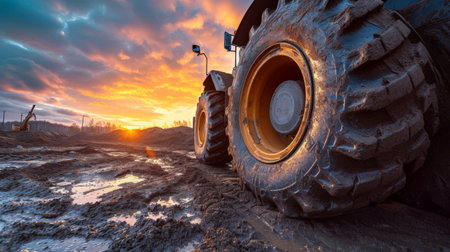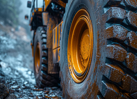 Heavy machinery with large yellow tires navigates a muddy construction site. the close-up view highlights the rugged texture of the tires and terrain, reflecting the challenges of working in wet conditions. Generative AI