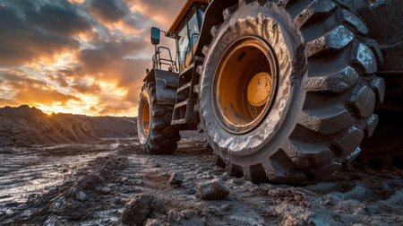 An impactful, low-angle shot focusing on the rugged tire and wheel of a yellow heavy-duty construction vehicle, set against a stunning, vibrant sunset and a blurred industrial worksite.