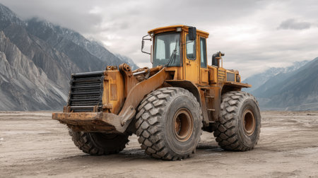 A heavy-duty yellow loader stands prominently in rugged terrain, showcasing its robust design and functionality against a dramatic mountainous backdrop under a cloudy sky.
