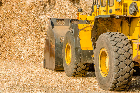 Yellow front loader with bucket down scooping wood chips for biofuel. View from left behind vehicle with pile in front of it.