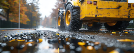 Construction equipment navigates wet pavement, a testament to the dedication to safe and efficient road development Even under challenging conditions, the project progresses, ensuring a smooth and secure infrastructure for the future AI Generative