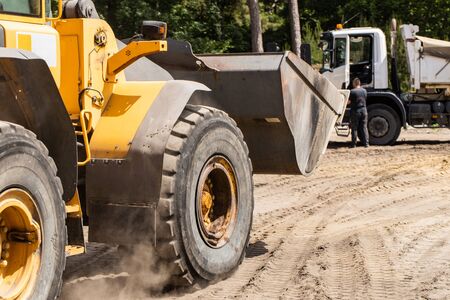 PRUSZKOW, POLAND, 26 March 2017: construction repavement works and yellow digger vehicle with huge black tyres. Nobody