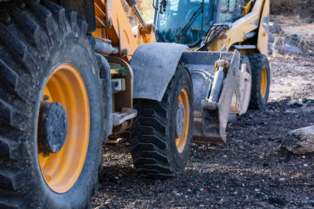 Heavy wheel loader with a bucket at a construction site. Close-up. Equipment for earthworks, transportation and loading of bulk materials - earth, sand, crushed stone