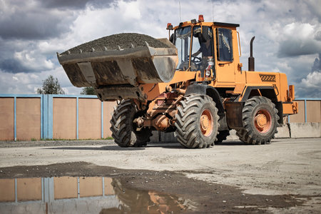 Heavy wheel loader with a bucket at a construction site. Equipment for earthworks, transportation and loading of bulk materials - earth, sand, crushed stone
