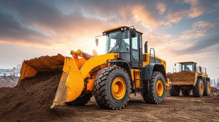 Heavy machinery at work on a construction site, featuring loader vehicles transporting dirt against a stunning sunset backdrop, showcasing industry progress and labor.