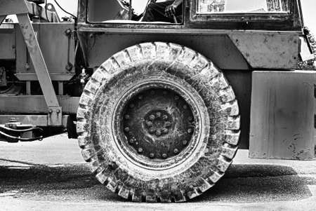 Truck tires close-up. Heavy duty construction equipment. Industrial background