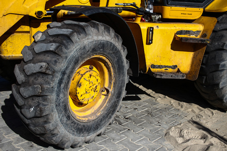 Big rubber wheels of soil grade tractor car earthmoving at road construction side. Close-up of a dirty loader wheel with a large tread with sky sunset