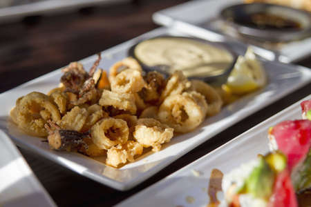 Fried Calamari Appetizer with Dipping Sauce in Restaurant