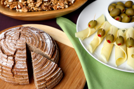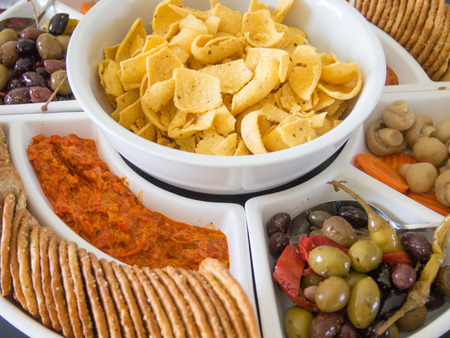 vegetarian platter with olives cheese and multigrain crackers, concept of healthy meal starters
