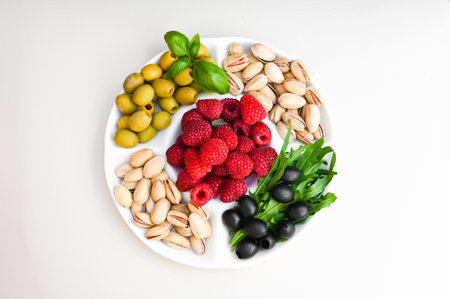 vegetarian snack in the form of raspberries, olives and pistachios. High quality photo