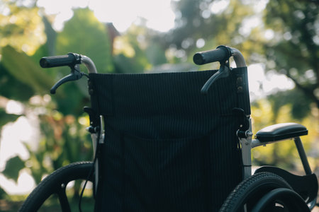 Empty wheelchair parked in park, health care concept with sun flare