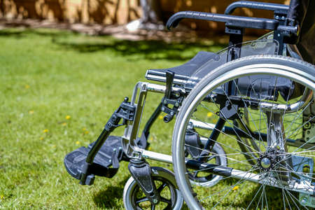 Close up of wheelchair for physical support in nursing home used by disabled people. Object of transportation for medical assistance and rehabilitation. Facility for recovery and treatment