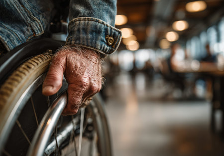 Hand of an individual holding wheelchair wheel, emphasizing determination and strength in a contemporary workspace filled with soft lighting and activity