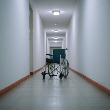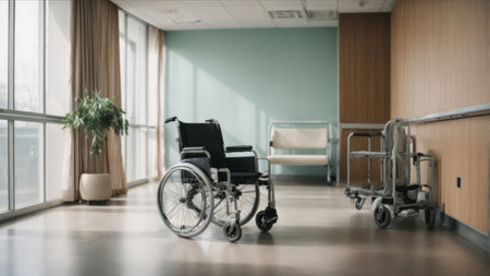 An empty wheelchair positioned in a long corridor illustrates themes of mobility, accessibility, and healthcare. The tranquil atmosphere and soft lighting evoke contemplation and the journey of patient care.