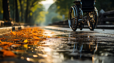 Black Electric Wheelchair on a Paved Path in Autumn, Offering Mobility and Independence.