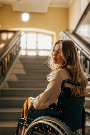 Young Woman in Wheelchair Sits on Staircase in a Beautifully Lit Building During the Day