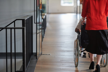 a businesswoman using a wheelchair moving through an office environment. The focus is on the wheelchair and the woman's hand as she propels herself forward