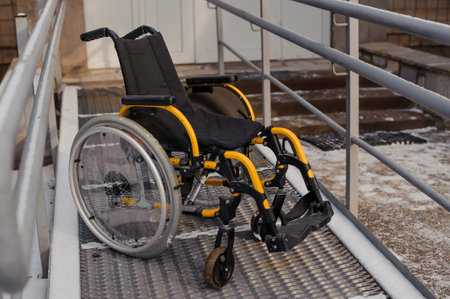Empty wheelchair in the hospital on the ramp. Wheelchair close-up. Children's wheelchair.