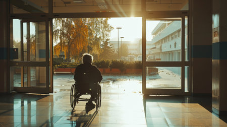 A patient in a wheelchair in a large, modern hospital, showcasing the comforting environment, advanced medical care, and supportive staff dedicated to their well-being and recovery.