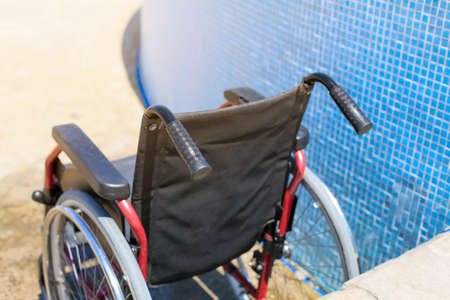 Empty wheelchair at accessible pool for assistance to help people with disabilities.