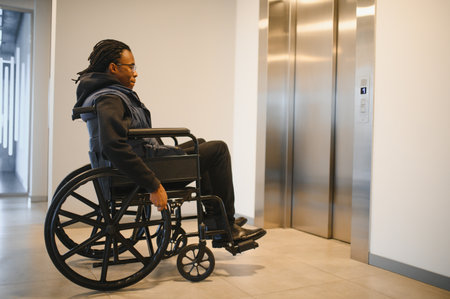Office worker in a wheelchair waiting for an elevator in a modern, accessible building designed for inclusivity and independence