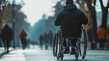 Male wheelchair user in blue denim jacket holds onto the red wheelchair handle, highlighting determination and independence in a bustling city atmosphere