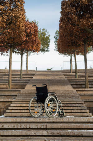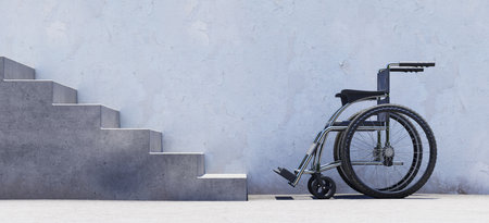 concept of accessibility with an image of an empty wheelchair in front of concrete stairs, emphasizing the need for equal rights and barrier-free urban spaces