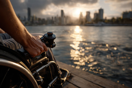 Hand firmly holds wheelchair, set against a softly blurred urban scene at sunset, capturing the essence of strength and independence in daily life