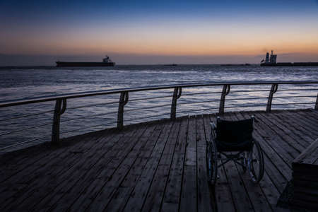 A wheelchair parked on a beach boardwalk with the ocean in the background, representing the pursuit of adventure and accessibility. --chaos