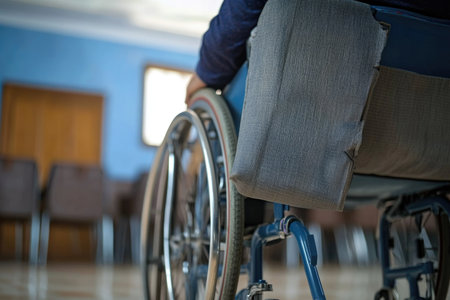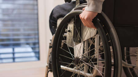 Retired person with physical impairment waiting in reception lobby to start checkup visit appointment with medic. Wheelchair user with disability in waiting room area at facility. Close up.