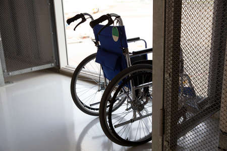 Blurred empty wheelchair near lift in private hospital for service patient and disabled people. Medical equipment in hospital for assistance handicapped people. Chair with wheels for patient care.