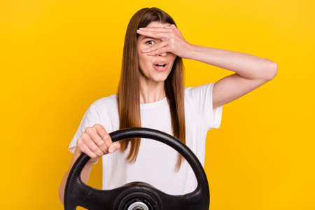 Photo of young positive happy woman hold wheel student driver peek eye cover hand isolated on yellow color background