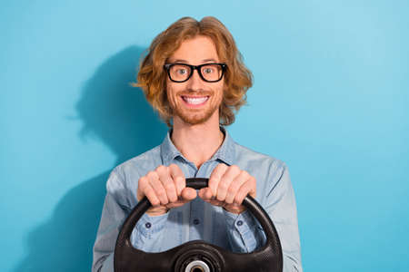 Photo of cheerful nice person arms hold steer wheel toothy smile isolated on blue color background