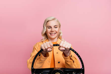 Positive blonde driver looking at steering wheel isolated on pink